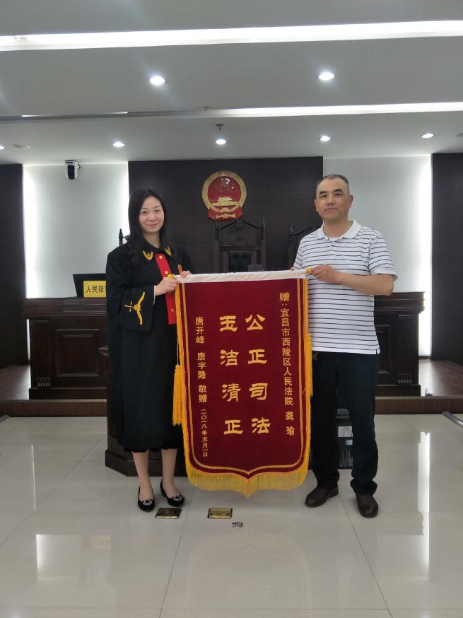 5月7日上午,當事人唐某的父親來到了宜昌市西陵區人民法院第九審判法庭,親自將寫有“公正司法,玉潔清正”的錦旗送到龔瑜法官手中,連聲感謝道:“多虧了龔法官,讓我們一家得到了公正的判決”。