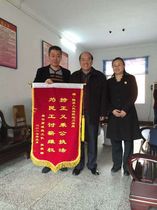 2017年4月18日,項目部將尚欠的124萬元匯至法院執行款賬戶,執行法官立即將此執行款發放給民工。結案后,以熊某為代表的民工為均川法庭送來了錦旗,錦旗上寫著“持正義秉公執法,為民工討薪維權”,熊某握著庭長的手激動的說到:“感謝法庭,沒有你們的幫助,我們不會這么快拿到工資!”