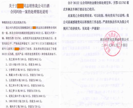 5月17日上午,房縣人民法院執行局法官張鏈收到一封來自湖北宜昌的快遞,打開后發現是湖北昭君故里酒業有限公司出具的買賣合同糾紛案件處理情況說明。